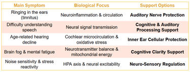 Biological Focus: Inner-ear microcirculation, antioxidant protection of cochlear hair cells, neuroinflammatory modulation, neurotransmitter balance, and mitochondrial energy support in auditory and cognitive neurons.