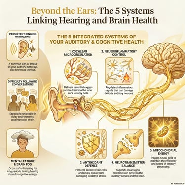 Auditory decline is rarely isolated to the ears. It is often linked to circulation, neural inflammation, oxidative stress, and age-related degeneration of sensory and cognitive pathways.
