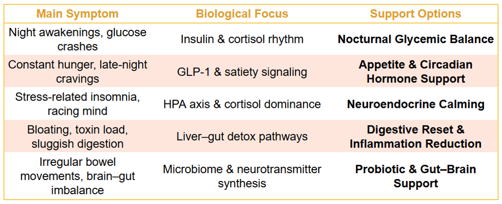 These patterns often reflect circadian rhythm disruption, cortisol dominance, insulin instability, and gut microbiome imbalance, which interfere with melatonin production and parasympathetic nervous system activation.